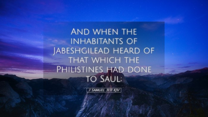 Verse Reference: 1 Samuel 31:11 - "But when the inhabitants of Jabesh-gilead heard of that which the Philistines had done to Saul,"