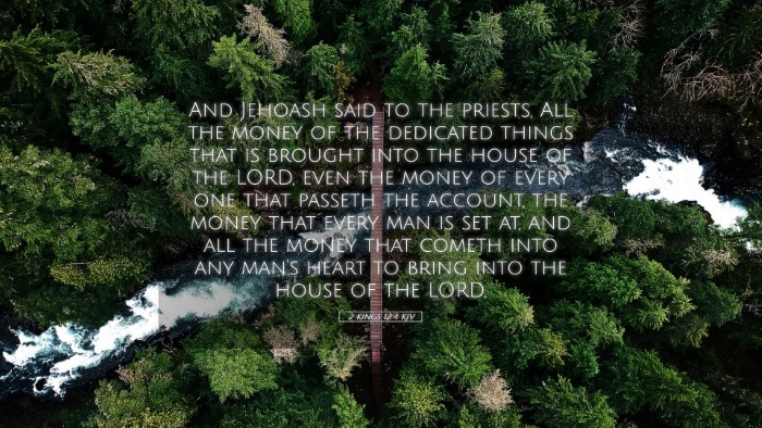Verse Context: 2 Kings 12:4 states, "And Jehoash said to the priests, All the money of the dedicated things that is brought into the house of the Lord, even the money of every one that passeth the account, the money that every man is set at, and all the money that cometh into any man's heart to bring into the house of the Lord," This verse presents an important moment in the life of King Jehoash and the economic practices surrounding the Temple in Jerusalem.