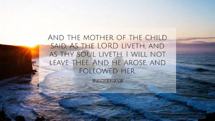 In conclusion, 2 Kings 4:30 is a powerful reminder of the intersection between human desperation and divine capability. The Shunammite mother's confident declaration of faith serves as an enduring testament to God’s willingness to respond to cries for help through His anointed servants. Whether one stands in the role of a minister helping others or a believer seeking God's face in the midst of trials, the text invites reflection and action based on the profound truth of God’s faithfulness.