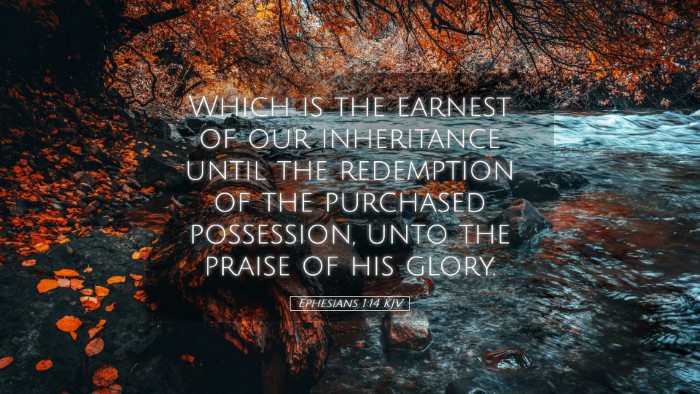Verse Context: Ephesians 1:14 states, "Which is the earnest of our inheritance until the redemption of the purchased possession, unto the praise of his glory." This verse encapsulates significant theological themes such as the role of the Holy Spirit, the concept of inheritance, and the assurance of salvation.