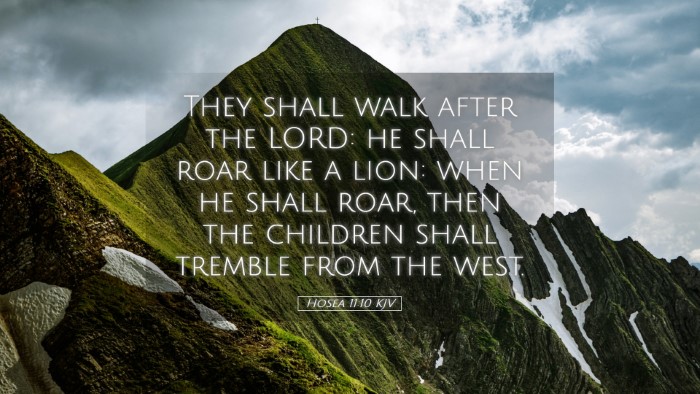 Verse Context: Hosea 11:10 states: "They shall go after the LORD: he shall roar like a lion: when he shall roar, then the children shall tremble from the west." This verse stands at the confluence of judgment, mercy, and restoration, encapsulating God's relationship with Israel in a profound way.