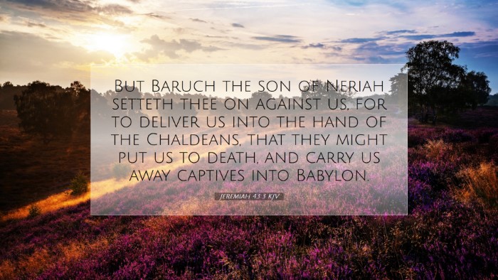 Jeremiah 43:3 captures a moment of deep psychological and spiritual turmoil in the aftermath of Jerusalem's fall. By synthesizing the insights of Matthew Henry, Albert Barnes, and Adam Clarke, a richer understanding of the text emerges—one that highlights the consequences of fear, miscommunication, and misplaced responsibility in a time of crisis. The enduring relevance of this scripture challenges today’s readers to reflect on their own responses to prophetic voices, calling them to accountability, deeper faith, and a commitment to accept God’s direction amidst the uncertainties of life.