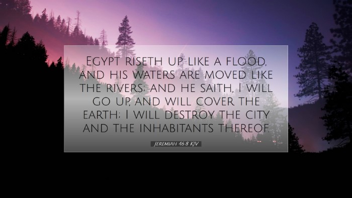 Jeremiah 46:8 encapsulates a profound message relevant across ages—addressing the themes of pride, destruction, and the need for humility before God. As individuals and communities reflect on these insights, they are reminded of the importance of aligning their ways with God's will. The prophetic words serve as both a warning and an encouragement to seek divine favor rather than worldly power. Pastors, students, theologians, and scholars must ponder these themes as they explore the depths of Scripture and apply them to themselves and their communities.