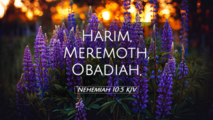 Nehemiah 10:5 serves as a profound reminder of the careful organization and dedication that should permeate worship in both ancient and modern contexts. The insights provided by Matthew Henry, Albert Barnes, and Adam Clarke encourage a holistic understanding of leadership, worship, and communal commitment to God. As the church endeavors to remain committed to God’s work, it must hold fast to the patterns set forth by those who came before, cherishing the call towards holiness, participation, and active ministry in the Lord's service.